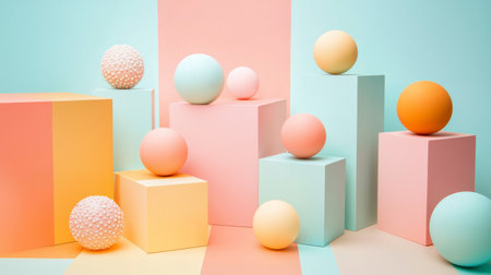 A minimalist abstract composition featuring pastel-colored spheres and cubes arranged in a balanced, geometric layout. The soft colors and clean lines create a modern, visually appealing scene, ideal for design and creative projects.