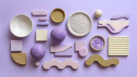A visually engaging arrangement of geometric shapes and textures in pastel lavender and cream tones, perfect for contemporary design and artistic inspiration.