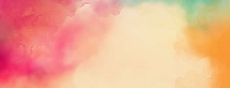 Colorful watercolor background of abstract sunset sky with puffy clouds in bright Easter colors of red pink blue green orange and beige