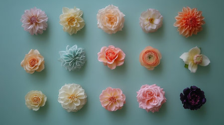 A stunning array of various flowers meticulously arranged on a soft blue backdrop, showcasing vibrant colors and intricate details perfect for decoration.