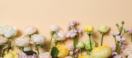 top view of spring flowers on beige background, panoramic shot