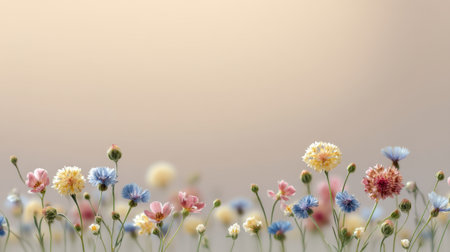 This captivating image showcases a vibrant arrangement of colorful wildflowers set against a soft, blurred background, perfect for conveying tranquility and natural beauty.