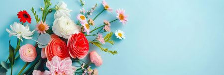 Pastel floral background banner. Top view of pastel colored spring flowers in pink, white yellow, orange on blue background mothers day concept, copy space for text