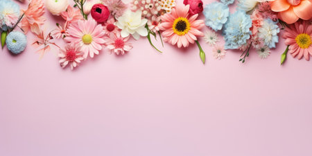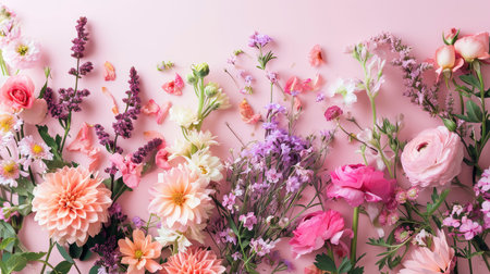 A vibrant display of various fresh flowers arranged beautifully on a soft pink background, ideal for projects focusing on nature, beauty, and creativity.