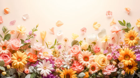 Vibrant assortment of spring flowers with scattered petals in soft focus, natural style, on light pastel background, concept of floral elegance
