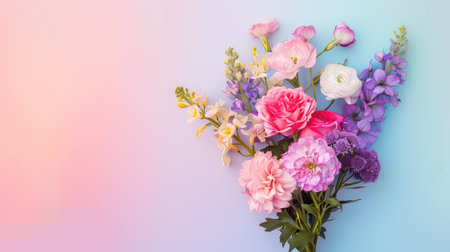 This image showcases a stunning bouquet of colorful flowers arranged beautifully against a soft gradient background, perfect for adding a touch of nature's beauty to any design project.