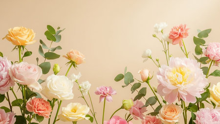 A lush border of soft pastel roses, peonies, and eucalyptus leaves is arranged against a creamy beige background, showcasing delicate blooms.