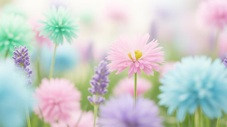 Including showing soft focus pastel colored flowers including pink daisies lavender and blue pom flowers in a gentle meadow with a bright ethereal light filtering...