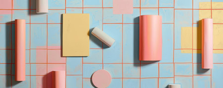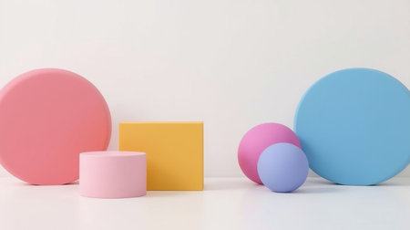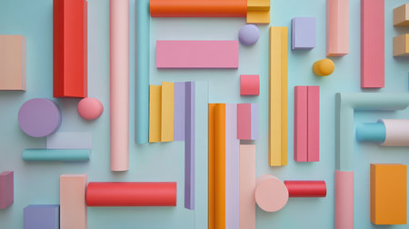 A playful composition of colorful geometric shapes placed on a pastel-colored background, creating a modern and vibrant design aesthetic.