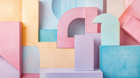 Explore a vibrant arrangement of geometric shapes in soft pastel colors, perfect for creative backgrounds, design inspiration, or artistic projects.