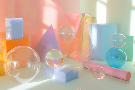 A minimalist arrangement of pastel-colored geometric shapes, including spheres and cubes, in a modern setting. The soft colors and clean lines create a calm and balanced composition.