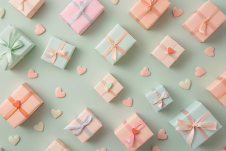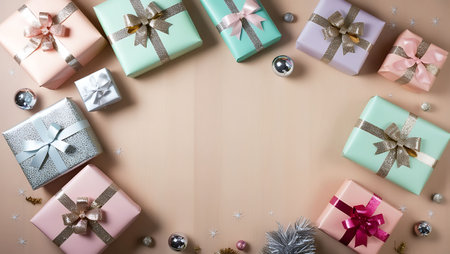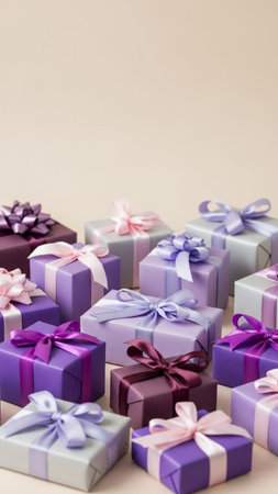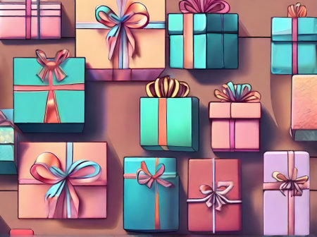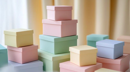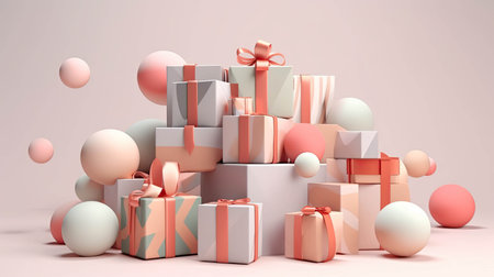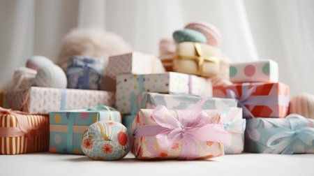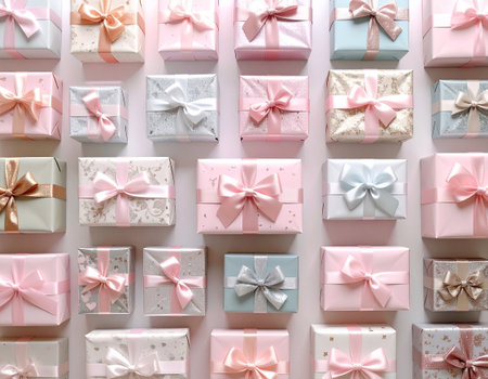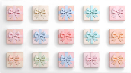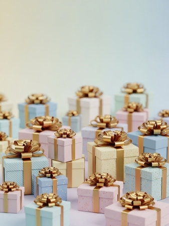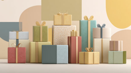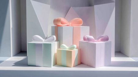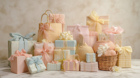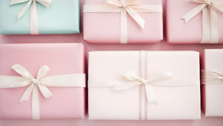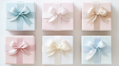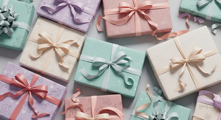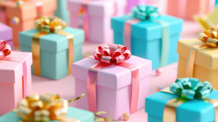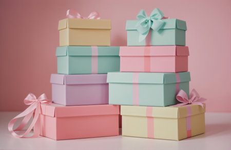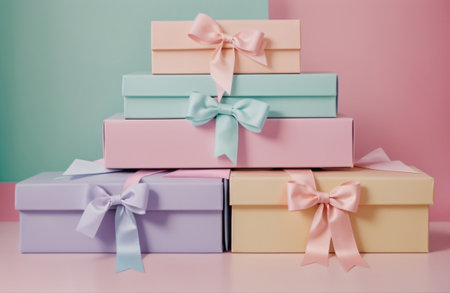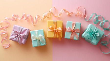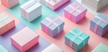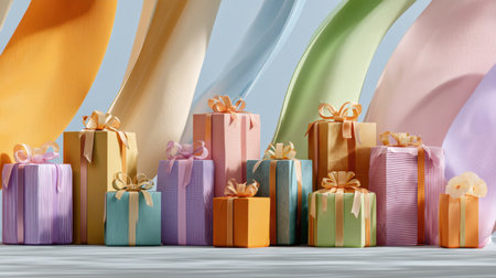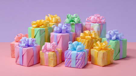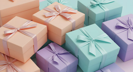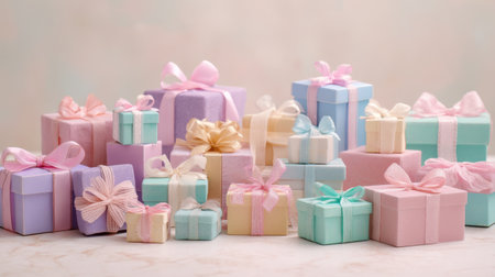 A delightful arrangement of pastel-colored gift boxes wrapped with ribbons, perfect for birthdays, holidays, or any celebratory event, exuding joy and elegance.