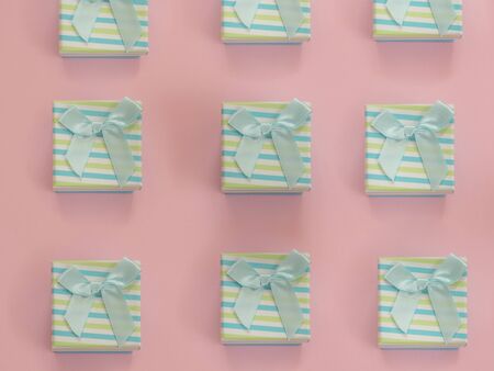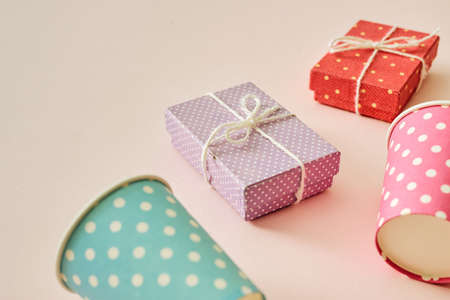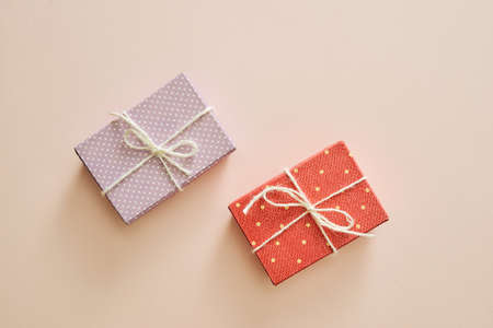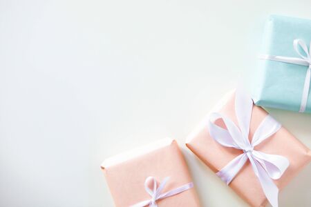 Gift boxes in pastel colors. Celebration, birthdays, Christmas and branding. Packaging. Top view. Small gift boxes.