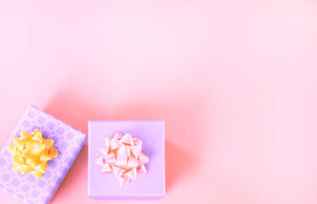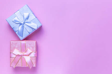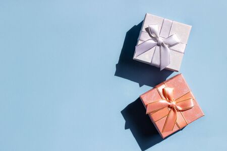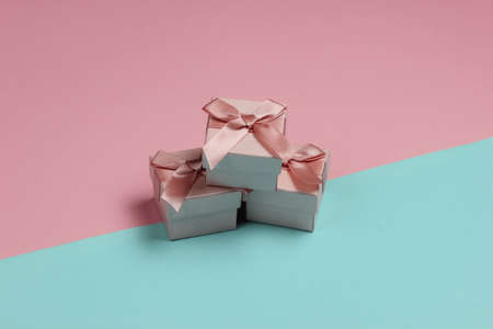 Gift boxes with bow on blue-pink pastel background. Composition for christmas, birthday or wedding.