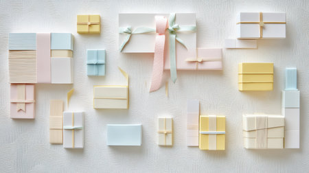 Handcrafted gift boxes in soft pastel colors are arranged creatively on a light background, perfect for celebrations and special occasions.