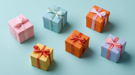 A delightful arrangement of colorful gift boxes with ribbons on a soft blue surface, ideal for showcasing festive occasions and adding charm to celebrations.