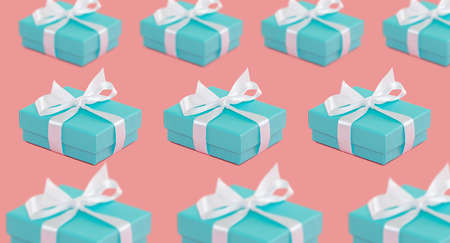Blue gift boxes with ribbons on pink background. 3D rendering.