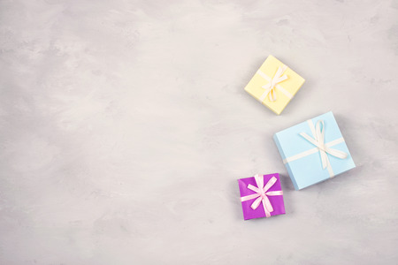 Festive, birthday, Gift pastel minimal background. Multicolored Gift boxes on gray cement background. Wedding, elegant, Love, birthday romance concept.