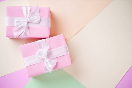 Colorful gift boxes with pink and green ribbons on pastel background