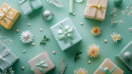 Flat lay of various gift boxes and decorative items arranged on a pastel green background, creating a festive and elegant scene.