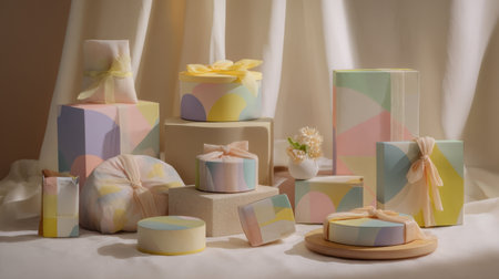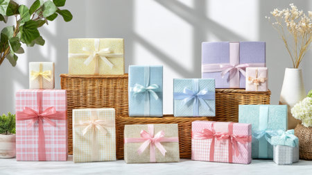 Beautifully arranged pastel gift boxes create a charming and festive atmosphere, perfect for special occasions. Elegant ribbons and delicate floral accents enhance the appeal.