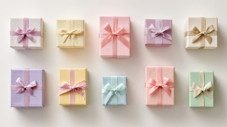 A charming assortment of pastel gift boxes tied with ribbons set against a soft background, perfect for showcasing celebrations, events, or special occasions.