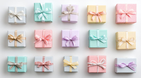 A stunning arrangement of pastel-colored gift boxes with elegant ribbons, beautifully lit against a white background, perfect for adding charm to any celebration.