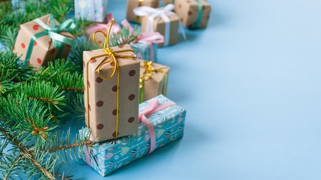 Christmas and New Year holiday background with gift boxes. Flat lay, top view