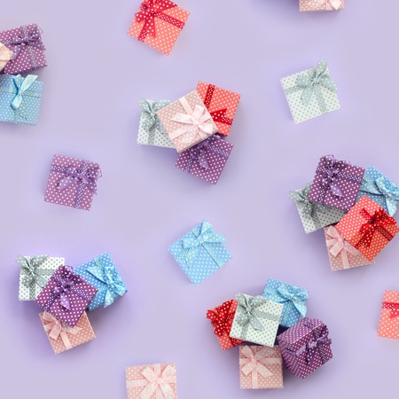 Piles of a small colored gift boxes with ribbons lies on a violet background. Minimalism flat lay top view pattern.