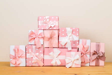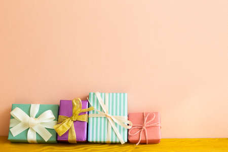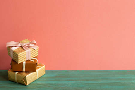 Colorful gift boxes on wooden table. pink background. copy space