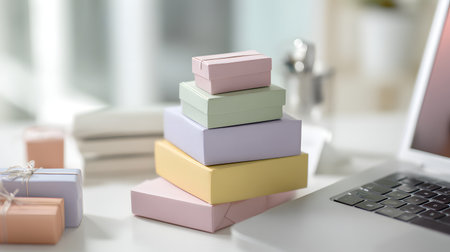 A vibrant collection of pastel gift boxes stacked artfully, perfect for celebrating special occasions. The soft background adds charm and elegance to the scene.