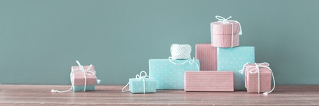Stack of Christmas handcraft gifts. Present Festive pink blue boxes.