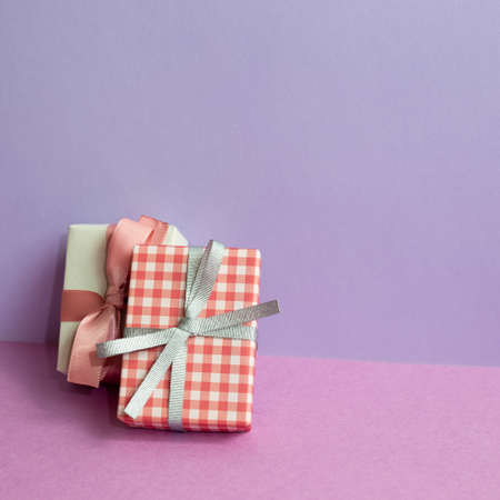 Fashion gifts or presents boxes with ribbon bow on purple background. Shopping, sale, discount concept. Valentine or woman day, birthday, Christmas or wedding card, banner, flyer.