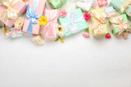 Beautiful spring composition with flowers and gift boxes on light background