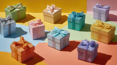 A delightful arrangement of colorful gift boxes with ribbons, set against a vibrant background. Perfect for holiday celebrations, parties, or special occasions.