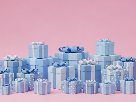A visually appealing arrangement of colorful gift boxes on a soft pink background, perfect for themes related to celebration, creativity, and festive designs in various projects.