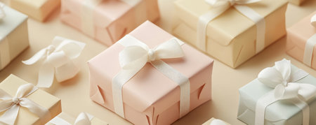 A minimalist background featuring pastel-colored gift boxes with elegant white bows, set against a soft cream backdrop.