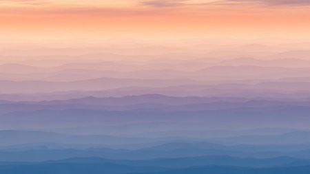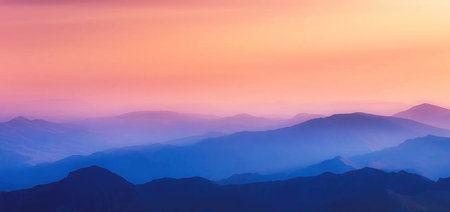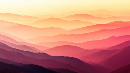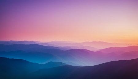 A breathtaking view of serene layers of mountains at sunset, featuring warm color gradients that inspire tranquility and calmness in nature