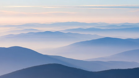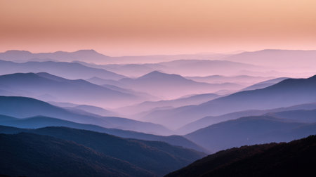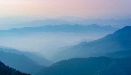 A breathtaking view of layered mountain ranges at dawn, showcasing soft hues of blue and purple. This serene landscape captures the essence of tranquility and natural beauty.