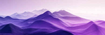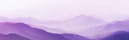 Soft lavender tones create a minimalist landscape with gentle hills and mountains. The soothing atmosphere evokes calm and tranquility during early morning light.