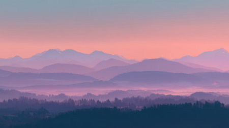 A breathtaking view of layered mountains at dusk, showcasing a gradient of soft pastel colors. This tranquil landscape invites a sense of peace and serenity.