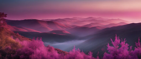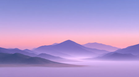 This captivating landscape image features a serene gradient of purple and pink hues at dusk, showcasing gentle mountain silhouettes enveloped in soft fog.