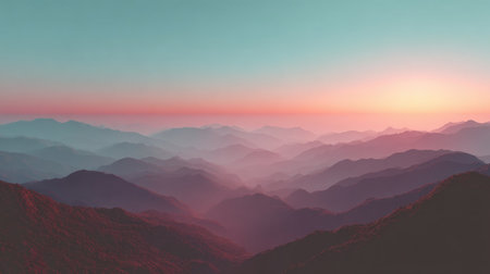Witness a breathtaking view of layered mountain peaks at sunrise, showcasing soft hues of pink and blue against a serene sky, creating a tranquil atmosphere.