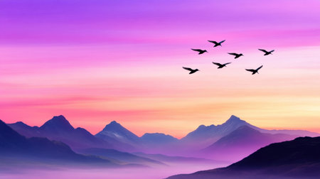 Calm twilight settles over distant peaks as birds glide above in perfect harmony
