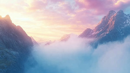 This stunning image captures majestic mountains at dawn, surrounded by colorful skies and soft mist, perfect for evoking a sense of peace and adventure.