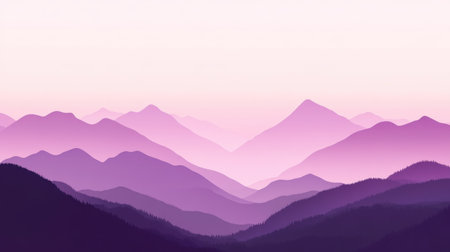 A tranquil gradient design features soft lavender gradually transitioning to pale pink, creating an ethereal atmosphere above layered mountains at dusk. The calm landscape evokes peace and reflection.