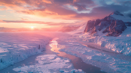 Majestic Sunrise Over Icy Glacier Landscape Showcasing Serene Waterway and Towering Mountains in a Remote Polar Region. Generative AI
