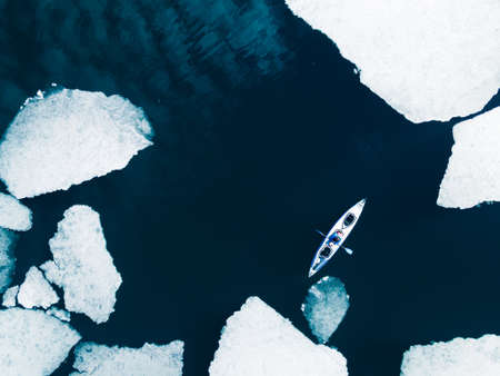 Kayak sailing between ice floes on Baikal lake in spring. Aerial drone view. Baikal lake, Siberia, Russia