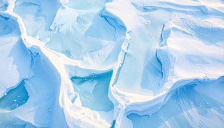 Aerial view of a frosty lakeshore, featuring intricate snow patterns on frozen water, cool cyan hues, and a tranquil atmosphere that invites reflection and appreciation