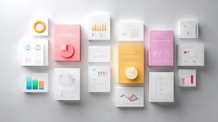 Artistic layout of colorful shapes, graphs, and charts on a blue background. Ideal for business presentations, digital marketing, and creative design projects.